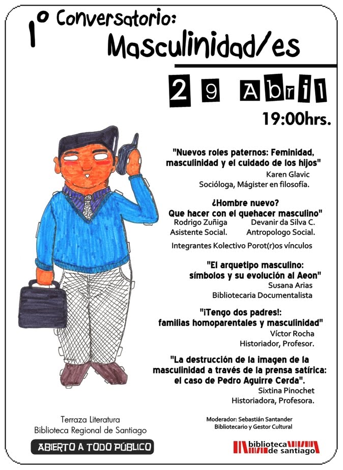 Les tenemos noticias…participaremos en el siguiente conversatorio sobre masculinidades en la Biblioteca Regional de Santiago. Espero que puedan asistir para aportar al conversatorio y reflexionar…Es el dia 29 de abril (un viernes) en la terraza de literatura de la Bilbioteca Regional de Santiago, en Matucana.