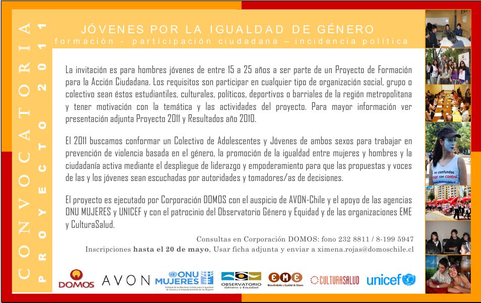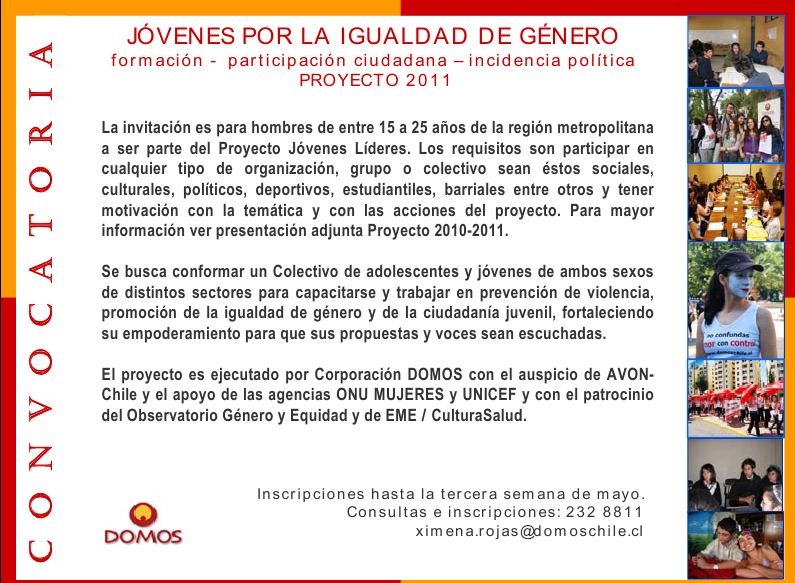Por otro lado, para vuestra información hay una campaña para liderazgo en jóvenes en temas de género que esta promoviendo DOMOS y aqui les dejo con el poster de promoción y cualquier consulta se contacta con Ximena Rojas, via su correo que sale ahi.